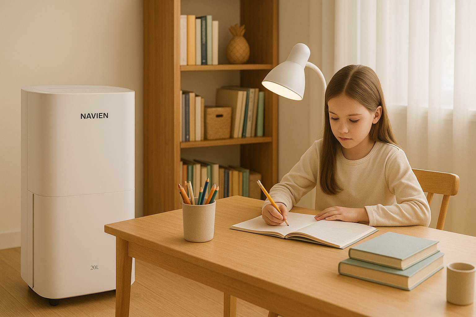 소음은 38~40dB 수준으로, 밤에도 켜두어 수면에 지장이 없습니다. 아이방, 서재, 공부방 등 예민한 공간에 적합합니다.